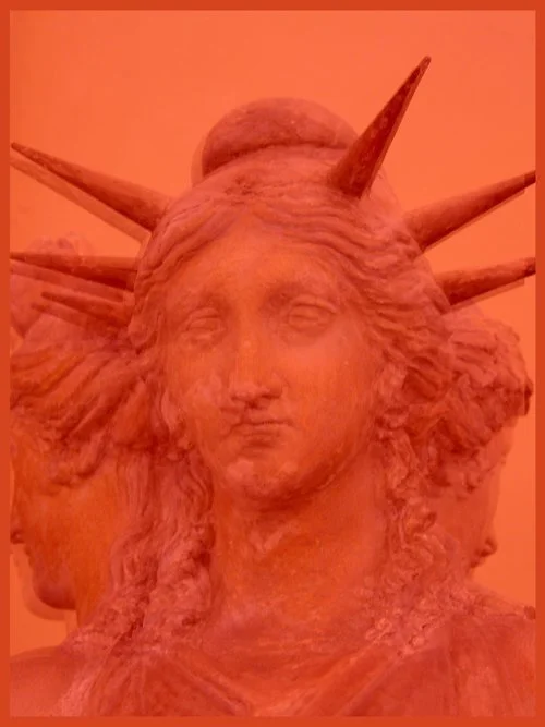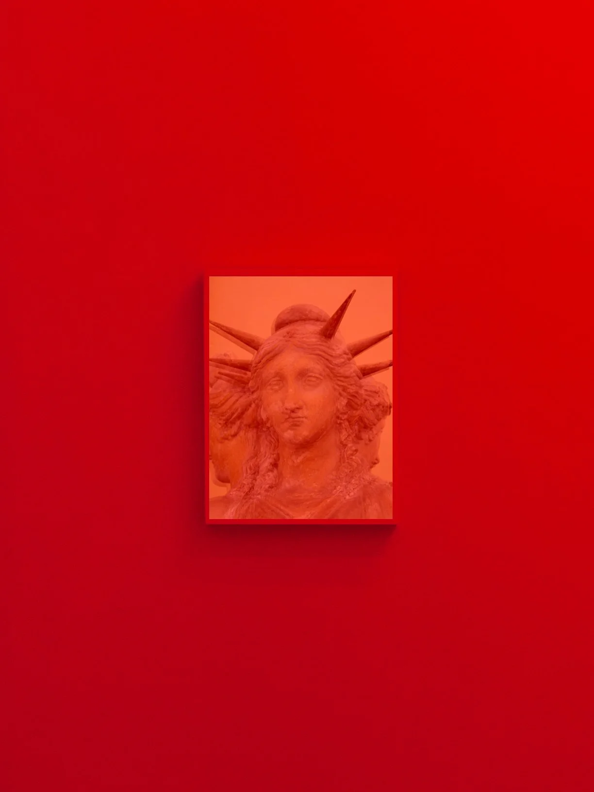 Hecate, 2018, found image - the Hecate Chiaramonti, a roman copy of triple Hecate after a Hellenistic original, archival pigment print in painted frame, installed on red wall, 400 x 300 mm. From Walking Backwards (towards the precipice) (2018), Project Space / Spare Room.