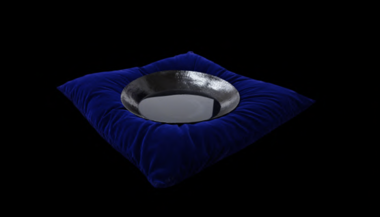 Narcissus Dish, 2019, crushed velvet, down, tin, enamel, water, 1200 x 1200 x 750 mm. From Truth and Paradise (2019), c3 Contemporary Art Space.